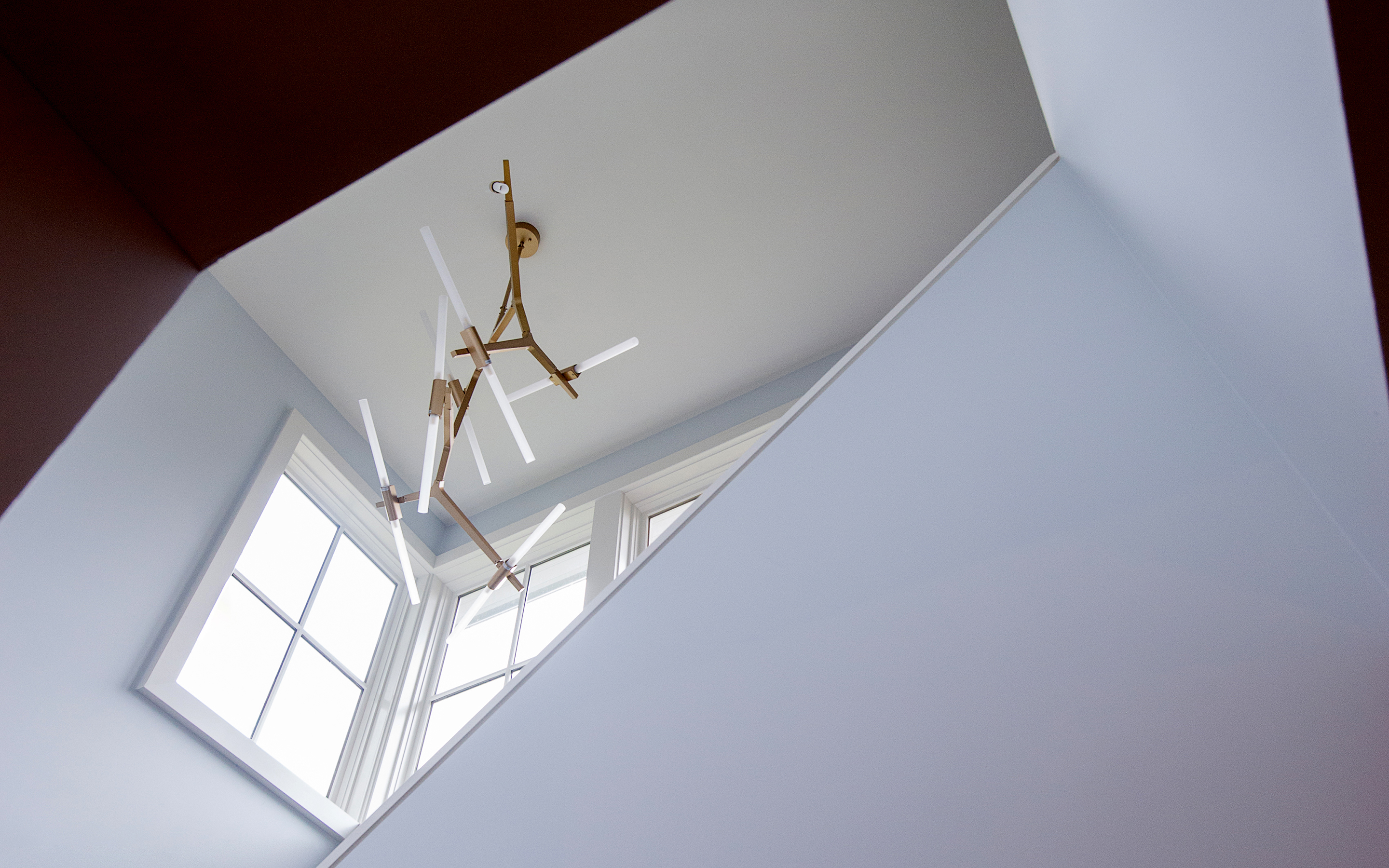 The new second floor addition allowed for a more gracious primary bedroom suite as well a child’s bedroom and guest room, pulling double duty as a home office. The perimeter of the rooms are banded in windows creating a tree-house feel. To top off the home, a play space and private guest suite were added within the gabled roof structure.