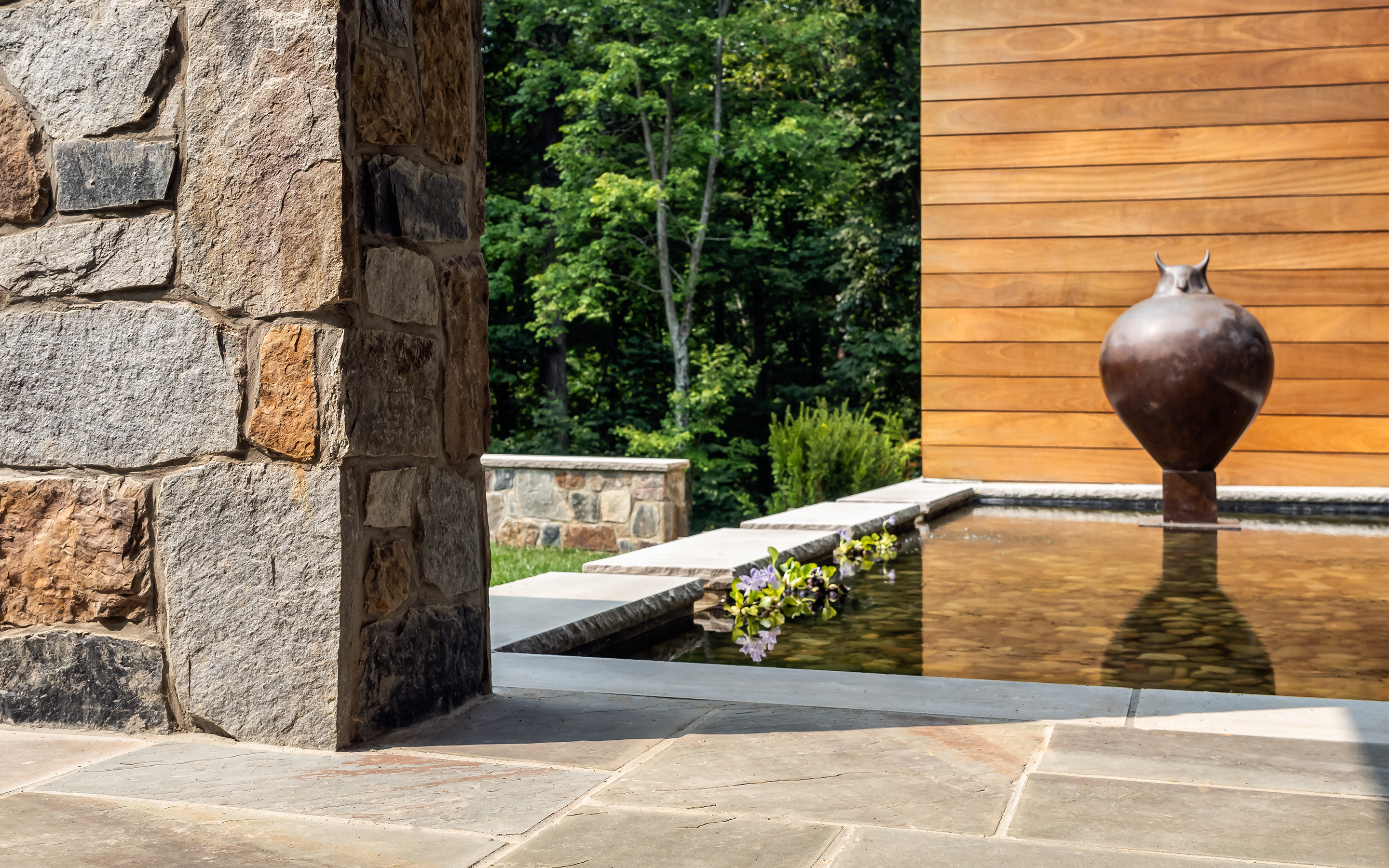 Ascending from the hillside, a succession of stone walls forms the basis of the residence. These walls not only serve as the home's foundation but also delineate distinct zones within the landscape and outdoor living spaces. Stretching beyond the perimeter of the residence, these masonry walls seamlessly integrate the structure into the surroundings while offering platforms to showcase the owner's collection of sculptural fauna.