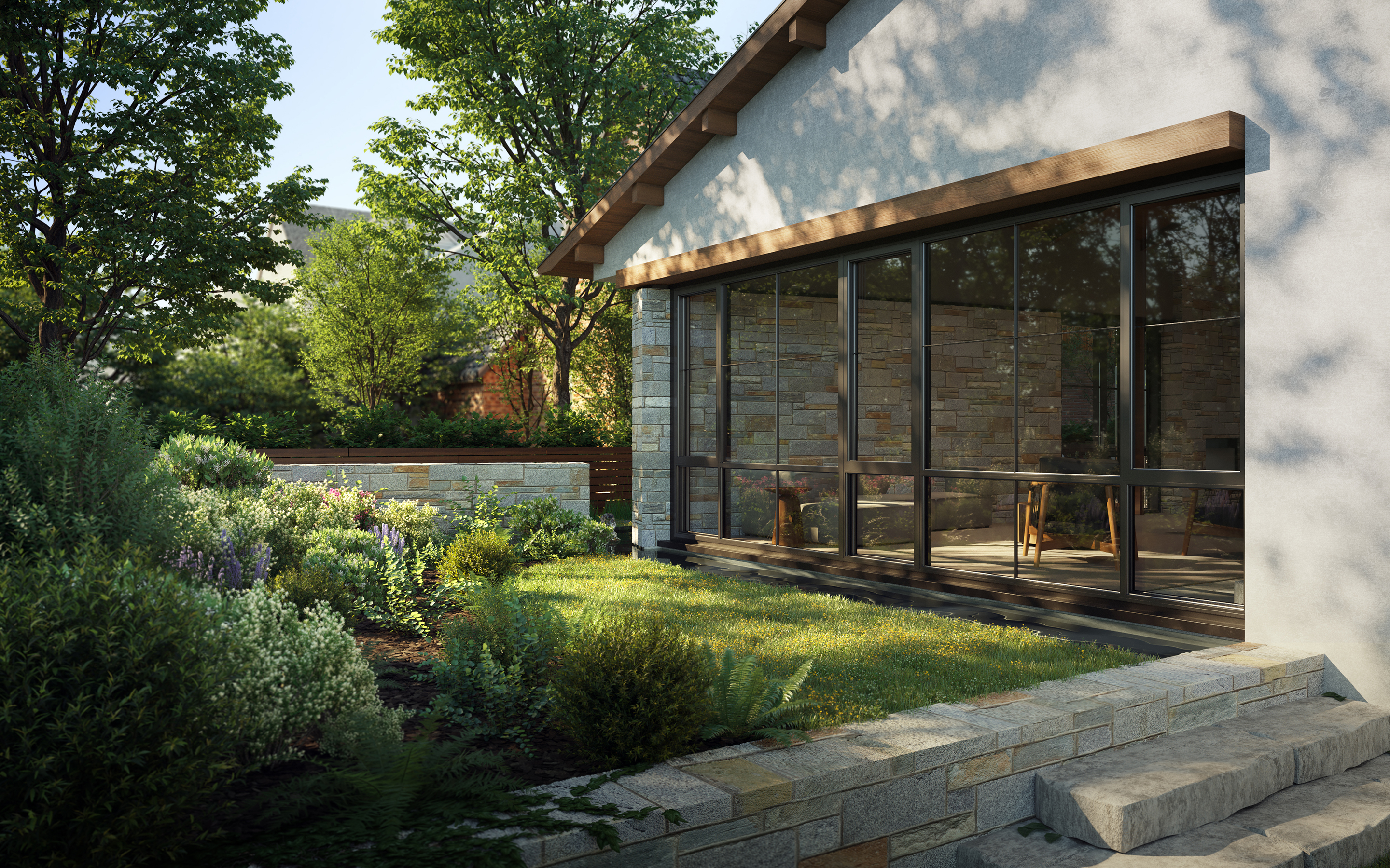 Challenged to design a home that fits within its small-lot zoning while also maintaining a sense of openness and connection to the surrounding landscape, the main living area was conceived of as “captured” space. The vaulted ceiling, wall of windows, and stone floor that extends outward to the exterior terrace, and connected by a see-through fireplace, help blur the line between inside and out. A defining element of this layout, the curved stone wall welcomes you at the front porch and pulls your gaze through the house and out to the rear yard where it creates the edge of a planting bed and reflecting pool that invites dappled sunlight to play across the interior surfaces.